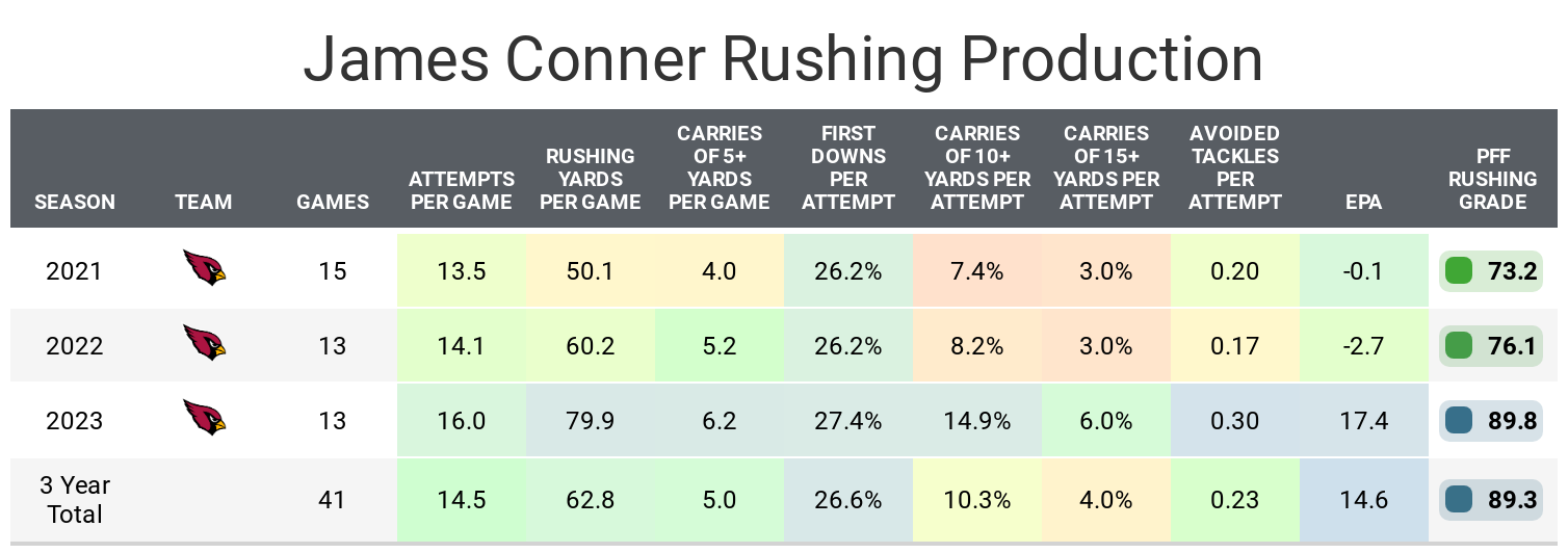 Conner was quietly a very productive rusher in 2023, leading to his first 1,000-yard rushing season. He averaged at least 4.4 yards per carry in all-but-two games last season, and his worst game finished with 3.75 yards per carry. He ended last season with four top-five fantasy performances in his last five games. That’s because seven of his nine touchdowns came over the last five weeks once Kyler Murray was back and the offense was playing better. His lack of receiving production is an obvious concern, as is his injury history and Trey Benson‘s presence. The worst-case scenario is that he becomes a two-down backup, but there is also a scenario where he stays healthy, Benson was more of a pick for 2025 and beyond, and the Cardinals offense is playing well in which Conner could be a top-10 running back.