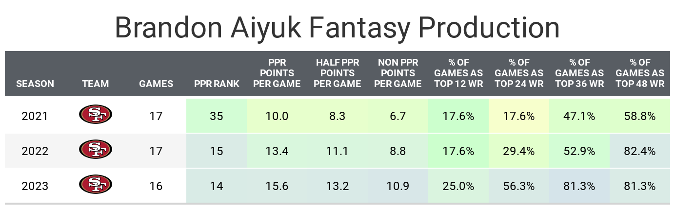 Aiyuk has been a very talented receiver held back by the San Francisco 49ers‘ run-first offense and quarterback situation. This past season, Aiyuk was unleashed with Brock Purdy. His average depth of target and deep target rate shot up, allowing him to finish at WR12 despite how often the 49ers run with the ball.