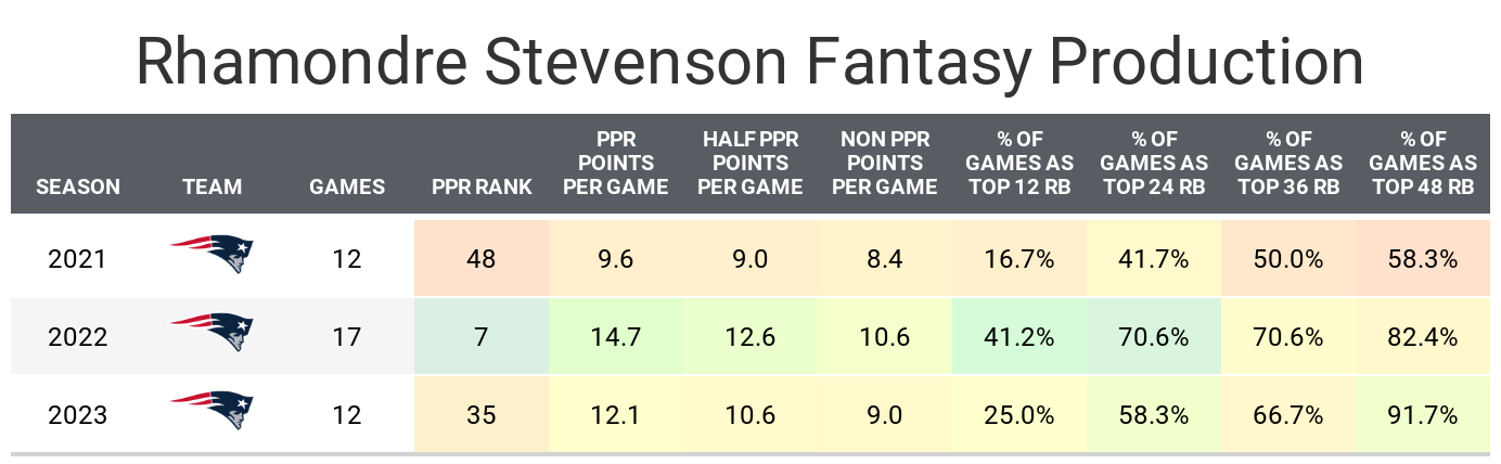 Stevenson didn’t quite live up to expectations last season with 12.1 fantasy points per game, but a lot of that had to do with the Patriots offense more so than Stevenson. The Patriots ran 98 plays in the red zone — 22 fewer than the next worst team. The quarterback situation should be a lot better this season, as well as the wide receivers. Ideally, the young offensive linemen can also improve, leading to more efficiency. At the very least, the Patriots still believe in Stevenson after recently signing a four-year, $36 million extension.