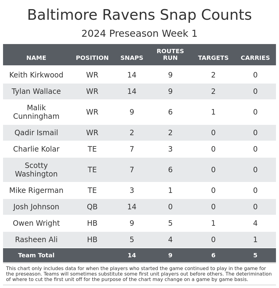 The Ravens were also missing Deonte Harty, who could also presumably be ahead of Walker. Even Qadir Ismail, an undrafted rookie who is learning both wide receiver and tight end, played some snaps in the slot before Walker’s first offensive snap.