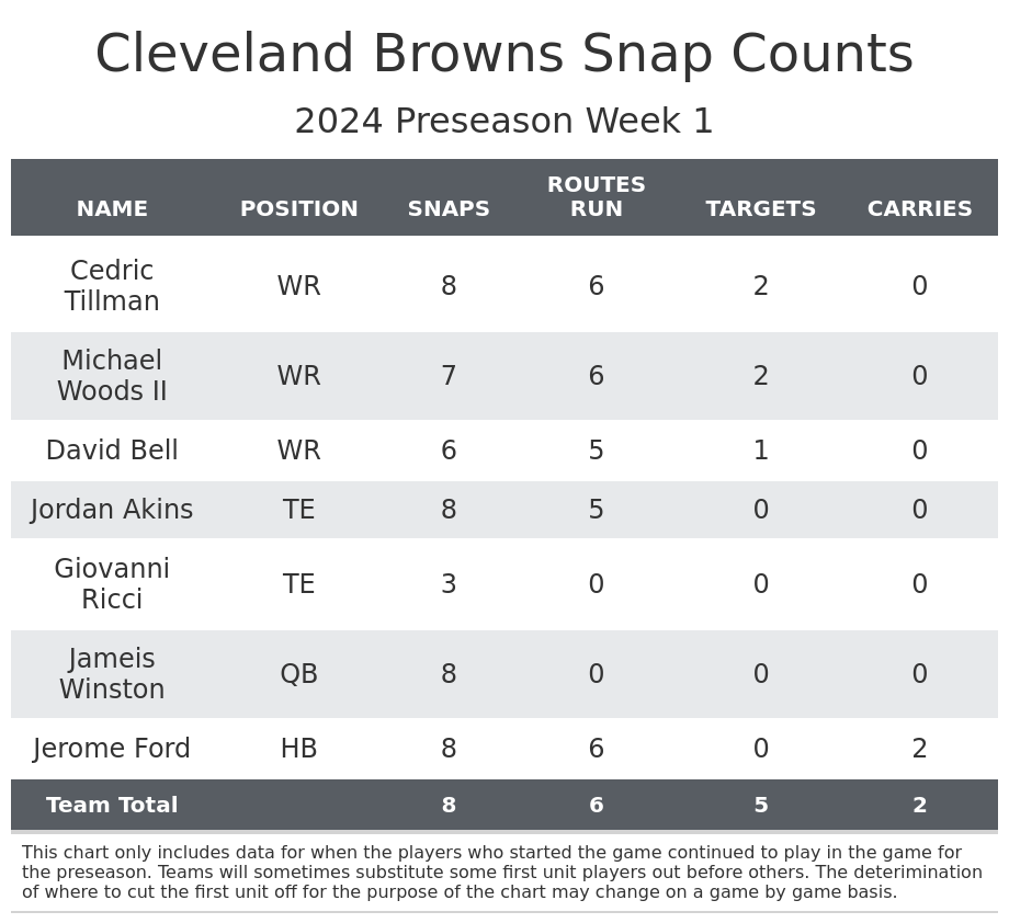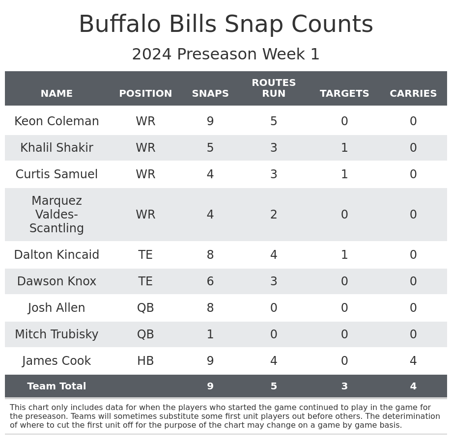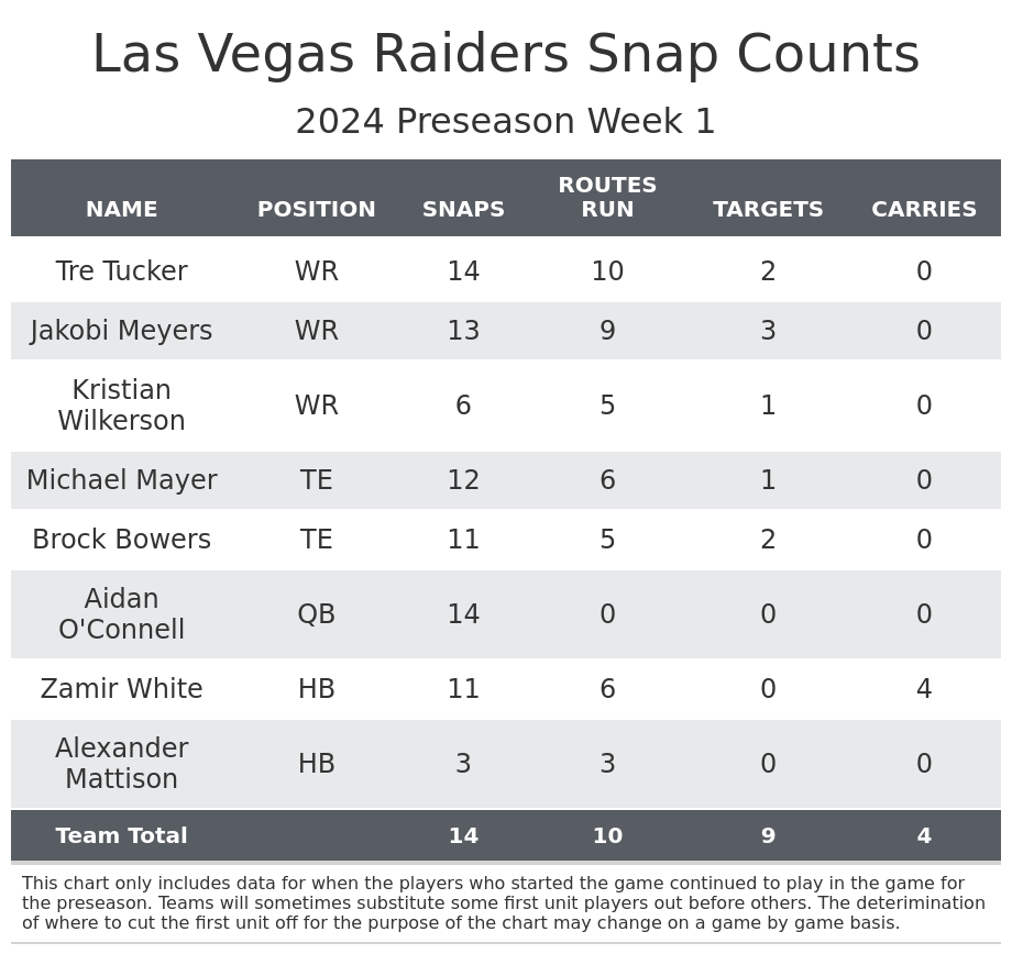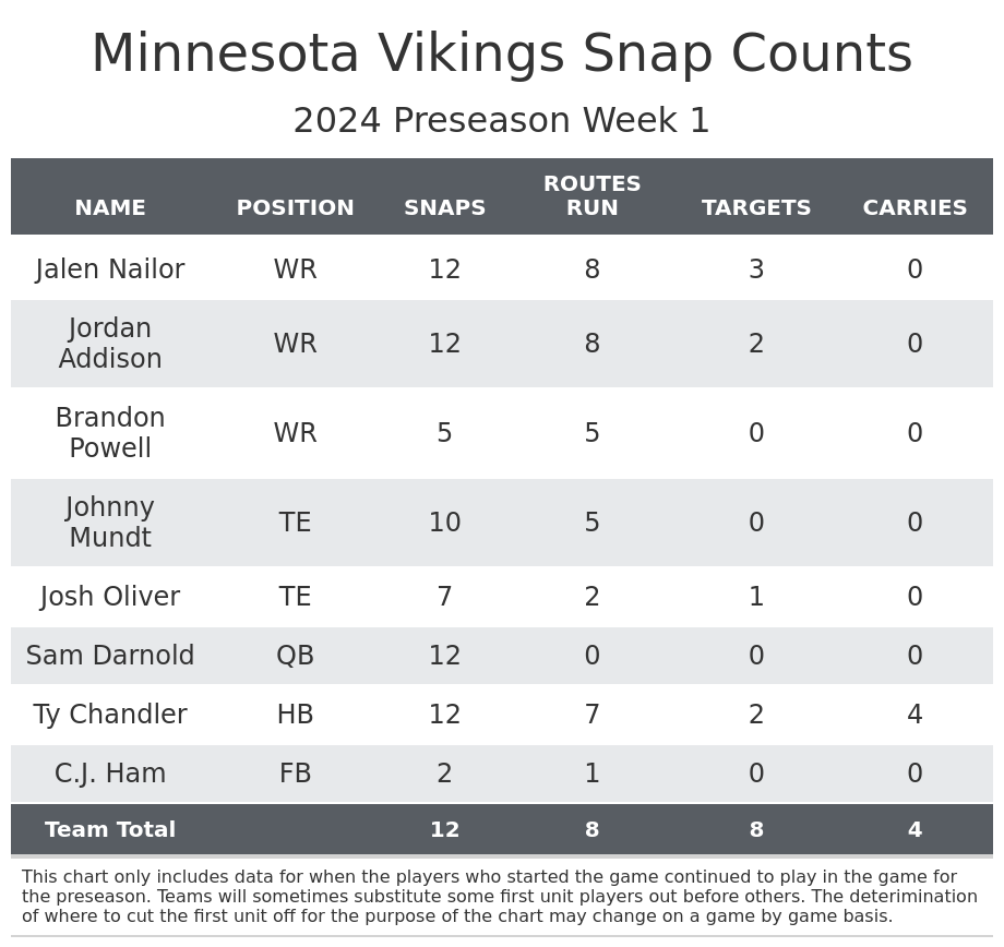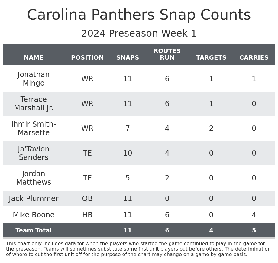 First-round rookie Xavier Legette missed this game due to injury while Diontae Johnson and Adam Thielen were among the veterans to take the night off. The Panthers only have 10 receivers on the roster, which is tied for the fewest among teams, so they only had seven wide receivers available for this game. Therefore, it made sense for everyone available to play roughly half of the game. Mingo was taken out at the end of the first quarter.