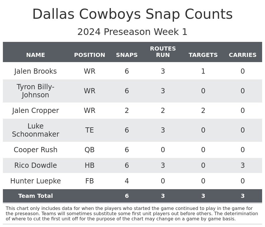 Dowdle also only played one drive with six total snaps, which was reminiscent of the Cowboys' first preseason game three years ago when Garrett Gilbert started at quarterback and Tony Pollard played the first six snaps before calling it a day. Pollard finished RB28 that season. This game didn’t give any indication of how snaps will be split between Elliott and Dowdle.