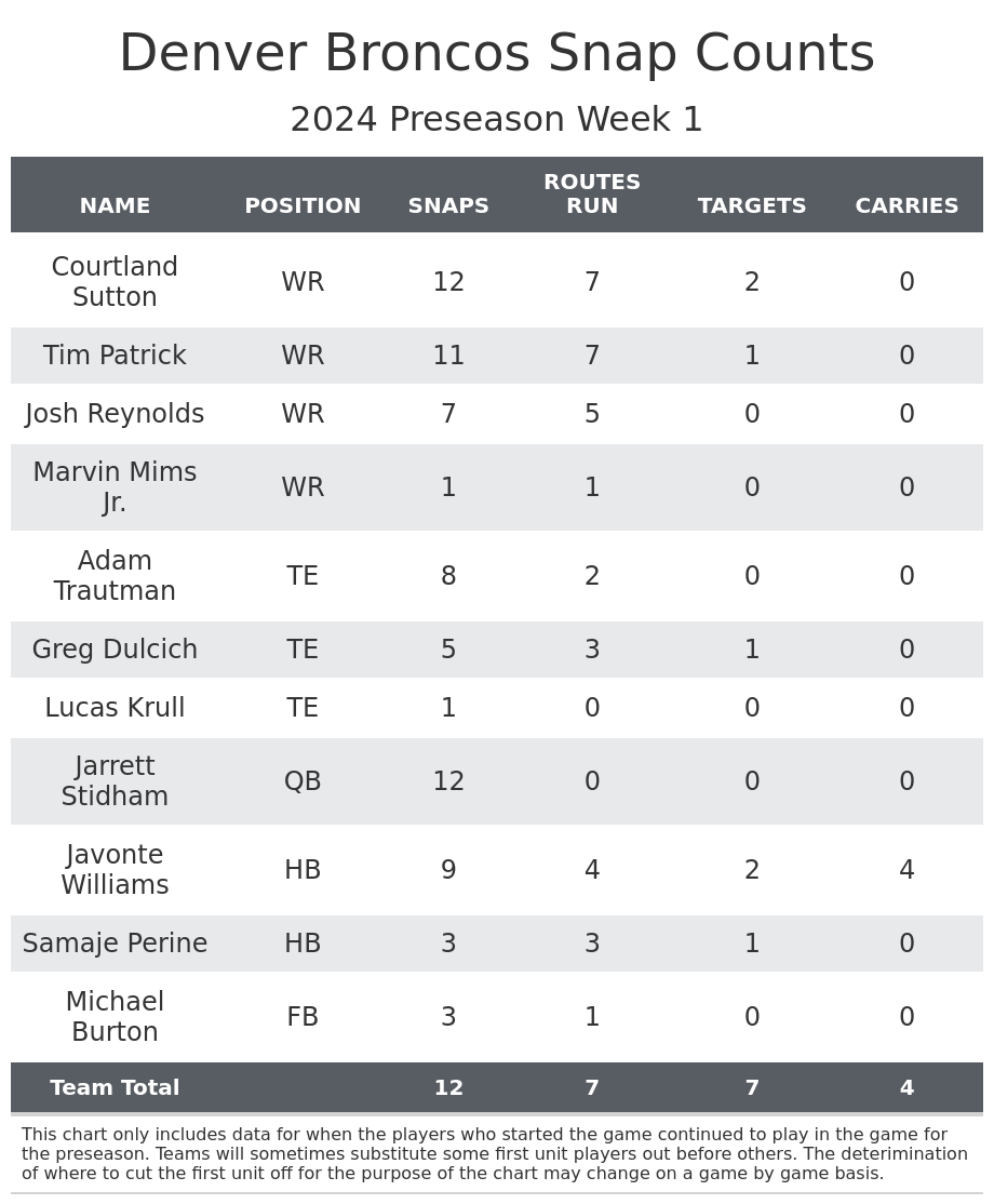 Javonte Williams started the game for Denver and played all of the snaps on the first two drives outside of clear passing situations, when Samaje Perine took over. This is the role both players had last season. On the Broncos’ third drive, they kept most starters in but switched to Bo Nix with Jaleel McLaughlin taking over for Williams. Audric Estime joined for the fourth drive while McLaughlin still rotated in at times and Perine still played on passing downs.