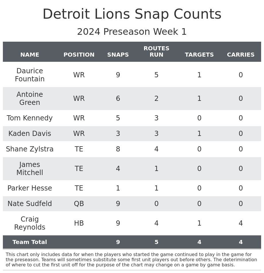 This means Vaki is the only threat to Reynolds, as we typically see rookies start low on the depth chart. Vaki had some nice runs, but he needs to surpass Jefferson on the depth chart before he has a chance to pass Reynolds. The third spot is important because if either lead running back suffers an injury, the third running back would likely play more snaps. We may see the Lions keep four running backs on the depth chart.