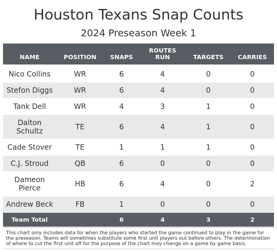 - Dalton Schultz played every snap with the starters and continued playing with the backups, which shouldn’t be alarming because the Texans had very few healthy tight ends.