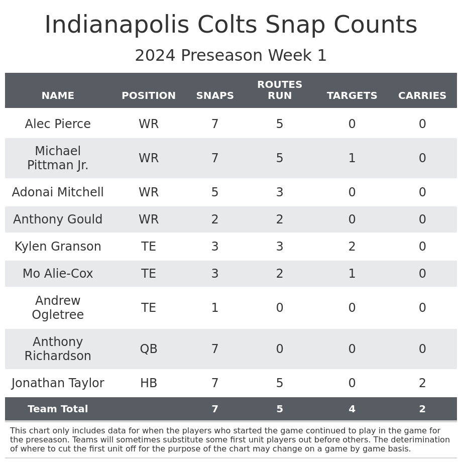 On the Colts’ third drive, they took Michael Pittman Jr. and all other starters out except for Mitchell and Pierce. The two played on the outside that drive with Gould in the slot. The Colts moved further down the depth chart at wide receiver for the fourth drive.