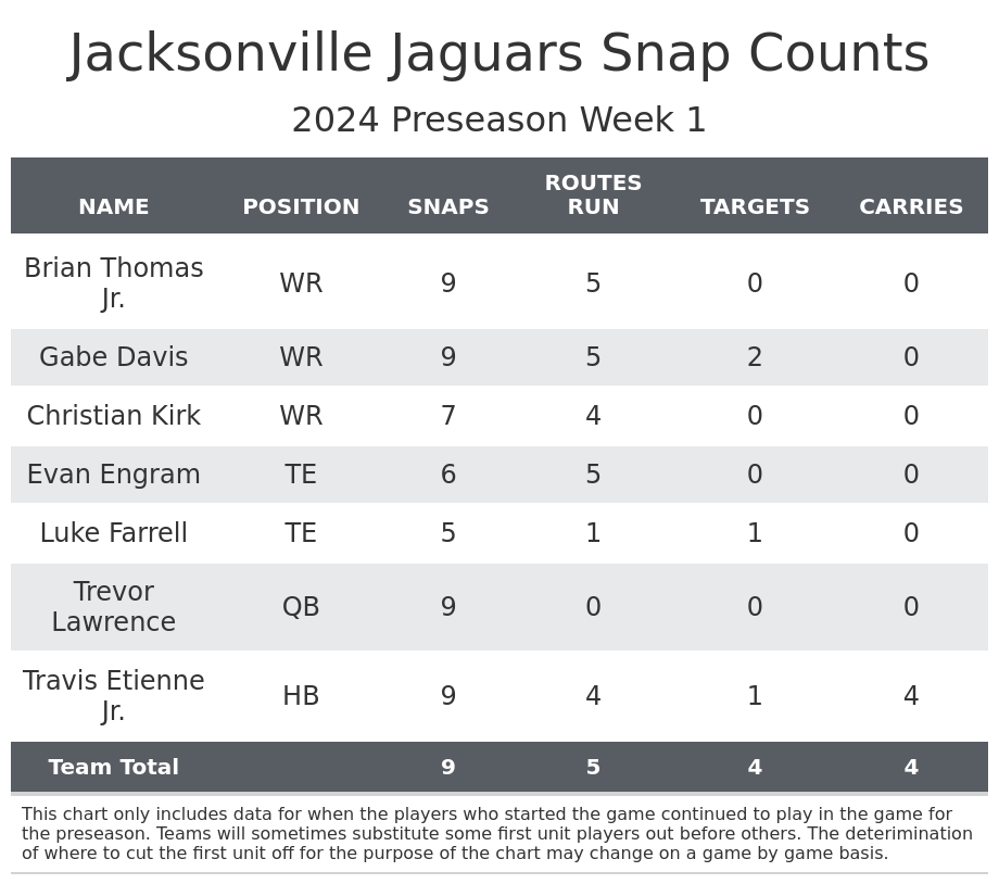 - Evan Engram only played six-of-nine snaps with the starters. Luke Farrell played three of the five snaps out of 11 personnel on first and second downs. Engram played 78.6% of 11 personnel snaps on first and second downs last season. This is a fairly small sample size of plays in a specific position where we know both players will play some, but Engram will be turning 30 years old in less than a month, so it’s possible he could play fewer snaps in these situations.