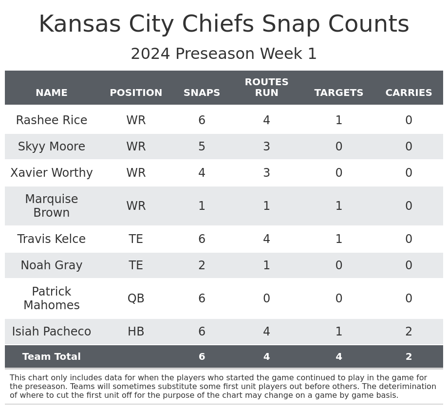 The Chiefs started the game with Rashee Rice, Hollywood Brown and Worthy. Brown caught the first pass and suffered a shoulder injury. It was a little surprising to see both deep threats in the starting lineup. Worthy played all of the 11 personnel snaps on the first drive while Skyy Moore took Brown’s place.