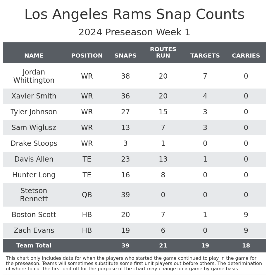 - While the Rams wide receivers who played in this game aren’t big names, Nacua and Robinson both started in the first preseason game last year. Nacua ended up not playing the rest of the preseason, so if we see the same thing out of someone like sixth-round rookie Jordan Whittington next week, that’s worth monitoring.