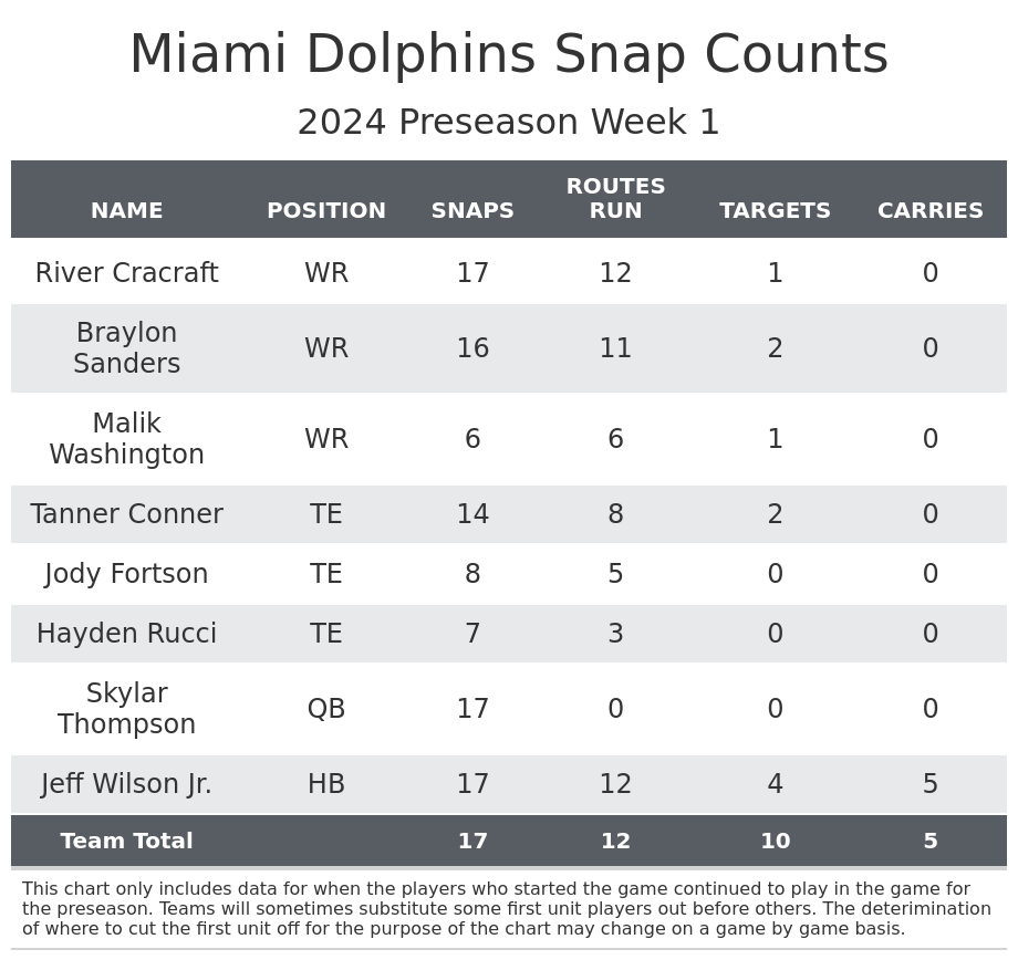 - The Dolphins rested quarterback Tua Tagovailoa, running backs Raheem Mostert, De’Von Achane and Salvon Ahmed, wide receivers Tyreek Hill, Jaylen Waddle, Braxton Berrios, Erik Ezukanma and Anthony Schwartz, and tight ends Jonnu Smith, Durham Smythe and Julian Hill.