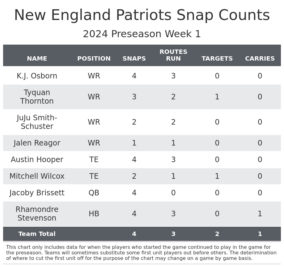 The Patriots rested wide receivers Kendrick Bourne and DeMario Douglas, who are dealing with injuries. Bourne remains on the physically unable to perform list while Douglas has been dealing with a hand injury. This left K.J. Osborn and Tyquan Thornton as the starting outside wide receivers while JuJu Smith-Schuster played in the slot. On the second drive, Polk and Jalen Reagor took over as the two outside receivers while Smith-Schuster remained in the slot. Thornton rotated back in for Reagor on the third drive.