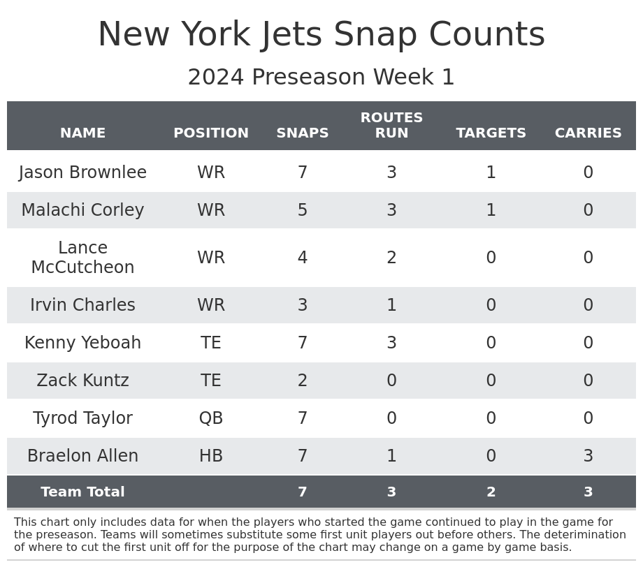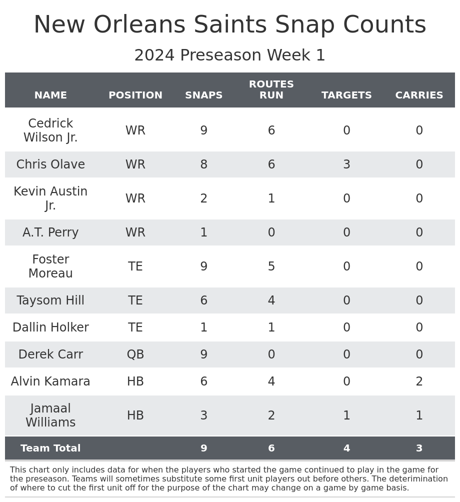 Wilson joined Olave for all seven snaps in 12 personnel. Rashid Shaheed is expected to join Olave in the regular season, but he is currently out due to injury. In 11 personnel, Kevin Austin Jr. came on the field. Perry’s only snap was in Olave's place. Most starters stopped playing after two drives, but Wilson kept playing, but Austin joined Wilson in two-receiver sets initially. By the fourth drive, Wilson stopped playing so much.