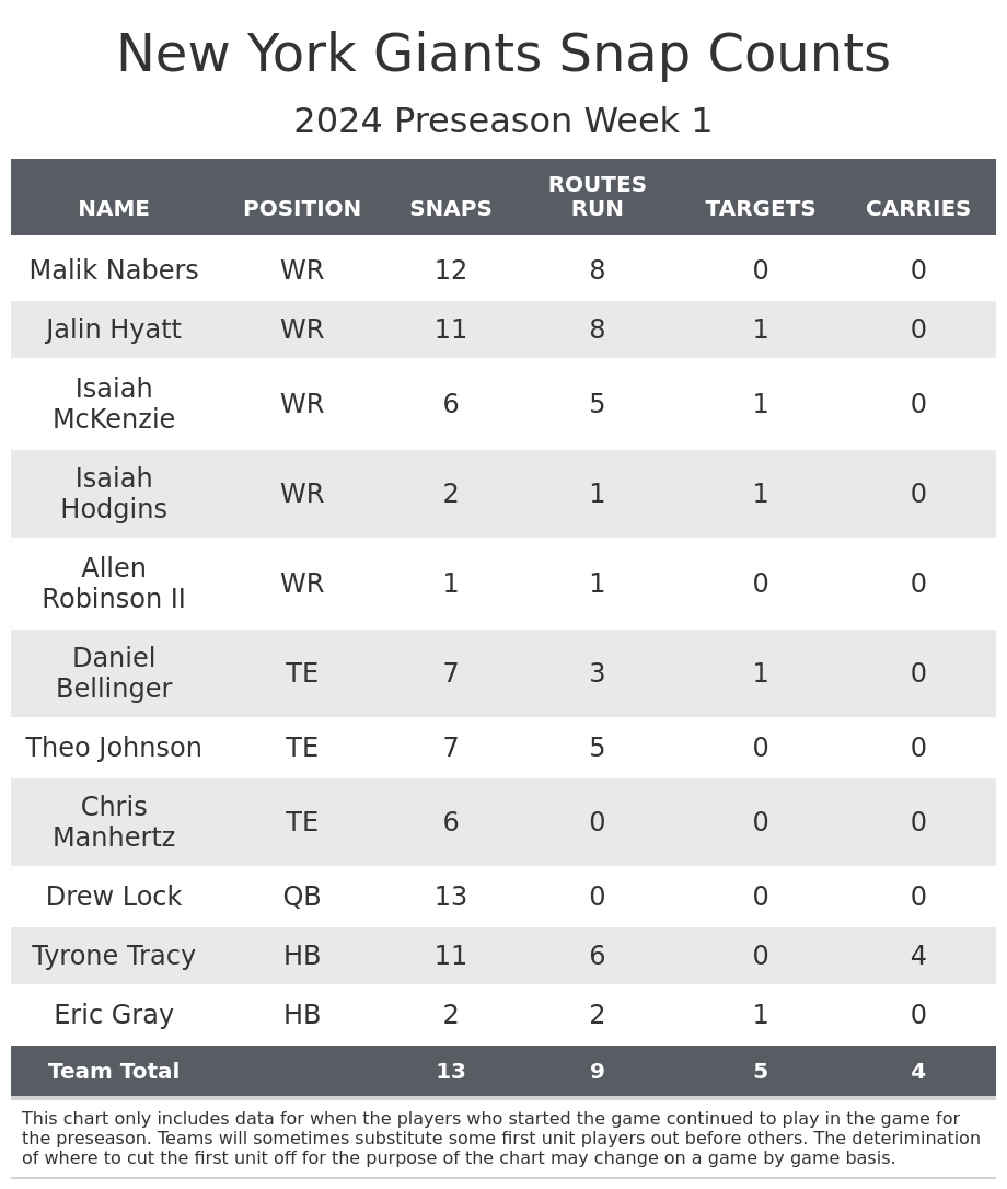The Giants retained Daniel Bellinger and Lawrence Cager, drafted Theo Johnson and added free agent Chris Manhertz in an attempt to replace Waller. Cager missed this game due to a hamstring injury, but the other three played with the first unit in this game. Cager was listed second on the initial depth chart behind Bellinger.