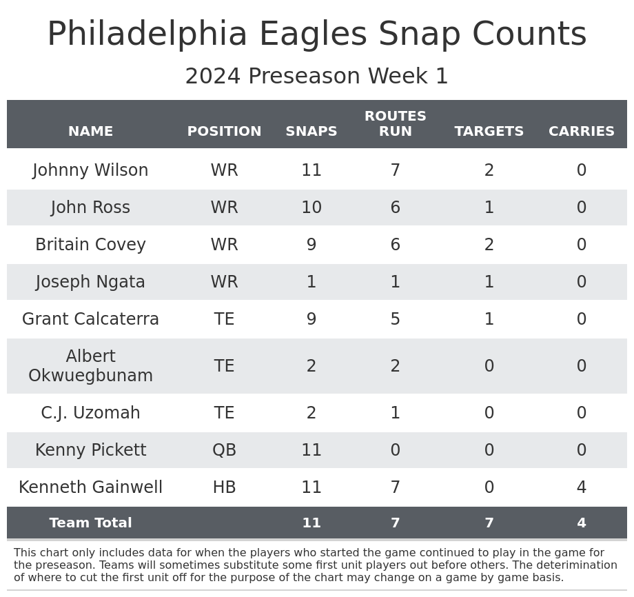- Grant Calcaterra appears to be Goedert's handcuff based on his 11 personnel usage Friday night, but C.J. Uzomah or Albert Okwuegbunam may earn more playing time this season due to their run blocking.