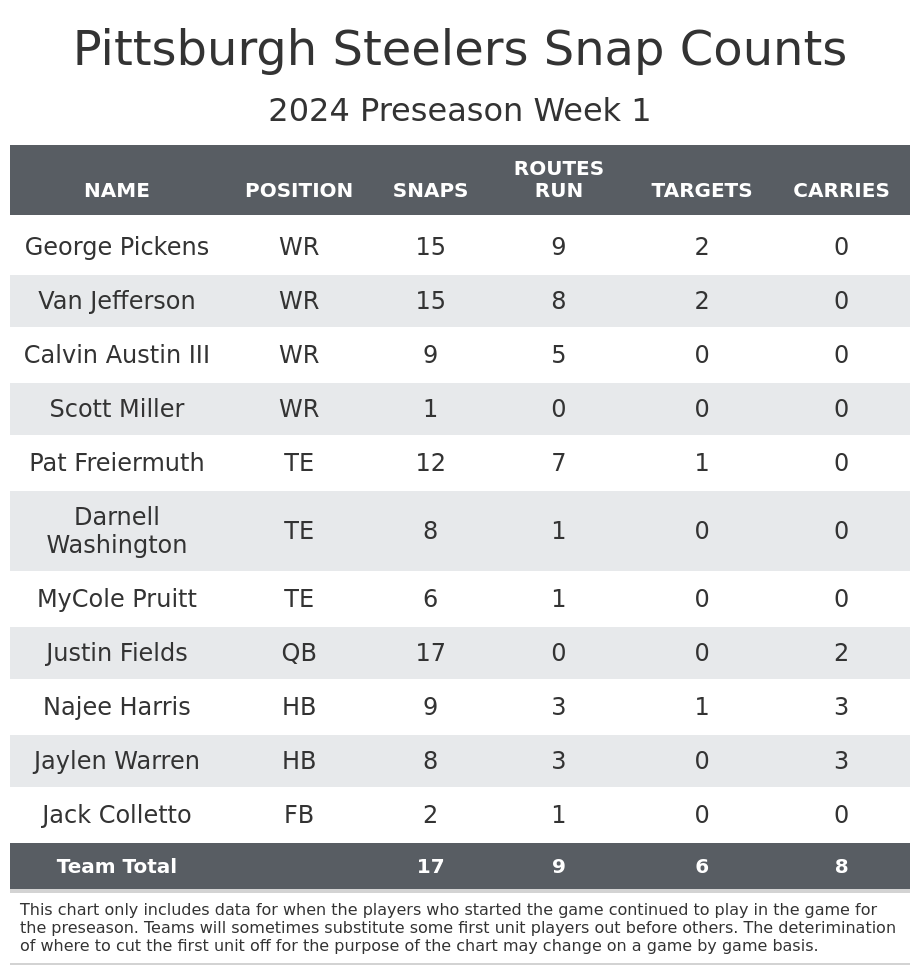How snaps are distributed in the slot is still up for grabs. Steelers rookie wide receiver Roman Wilson missed this game due to a left ankle sprain and is considered week to week. He was reportedly fighting for the slot spot. Calvin Austin III was listed ahead of him on the initial depth chart and played the slot snaps out of 11 personnel with the starters tonight.