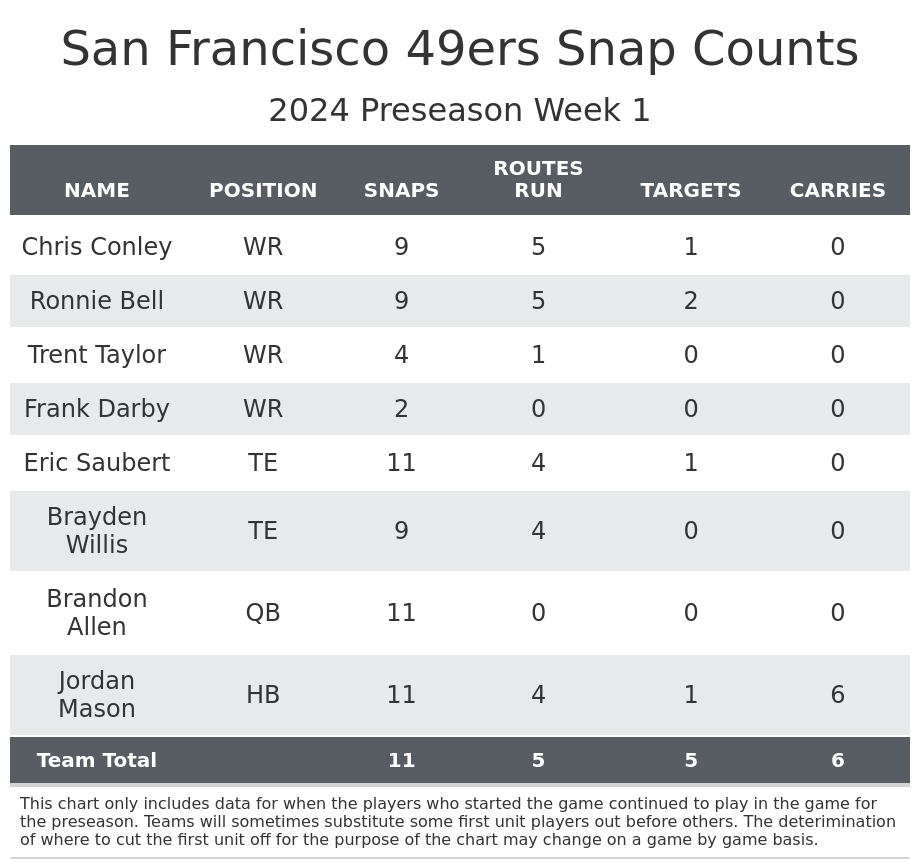 - All of the running backs were out due to injury. There has been talk of Jordan Mason taking over as the RB2. He only played on the first drive while the rest of the 49ers offense played beyond that.