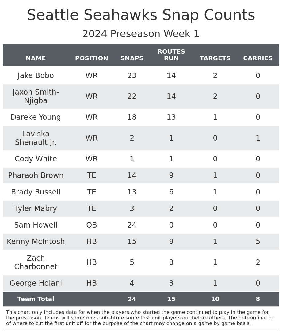 The Seahawks rested the other skill players expected to play in 11 personnel this season, so it was a little surprising to see Smith-Njigba play. Fellow second-year player Zach Charbonnet only played in one drive, so it was also surprising that Smith-Njigba played three.