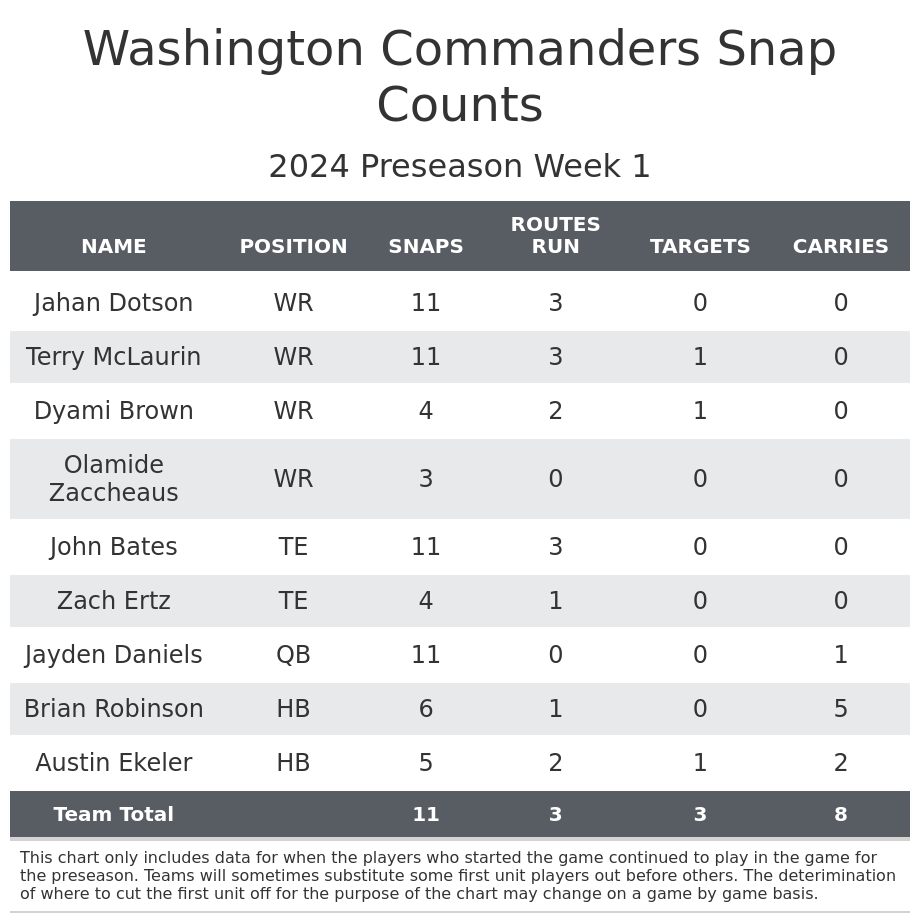 Washington only used its starters for one drive, so both players are being considered among those starters. The two continued a frequent rotation. Robinson played more snaps on early downs and Ekeler played more late-down snaps. This included both players taking snaps when the team was within five yards of the end zone. Ultimately, rookie Jayden Daniels scored a three-yard rushing touchdown to end the drive.
