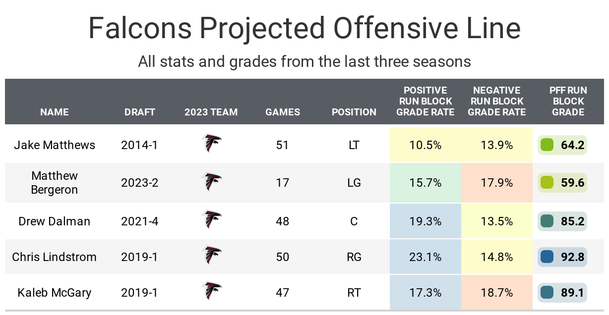 Tyler Allgeier leads all running backs who are true handcuffs, playing behind Bijan Robinson. The first reason he stands out is his talent, as his 90.6 PFF offensive grade the last two seasons is fourth-best among those with at least 500 snaps. The Atlanta Falcons also have the NFL's second-best run-blocking offensive line.