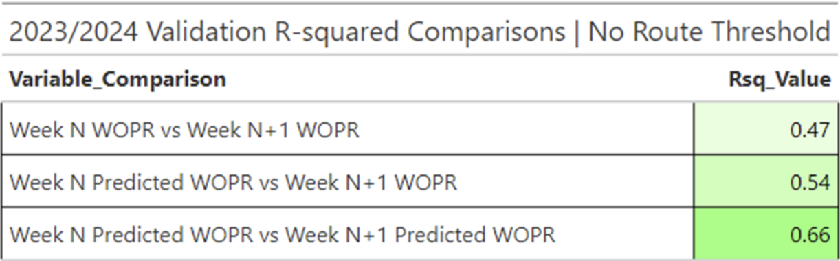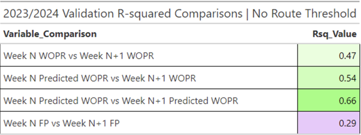 Before diving into the details, I’d like readers to know that Predicted WOPR has the potential to outperform Actual WOPR when it comes to predicting future outcomes. WOPR is widely regarded as one of the most stable metrics in mainstream fantasy usage, with a .47 R-squared (Rsq) when predicting N+1 WOPR for the 2023 season without any route threshold. In comparison, Predicted WOPR achieves a .66 Rsq for predicting N+1 Predicted WOPR during the same season. This indicates a notable improvement in stability, with a .19 raw Rsq stability enhancement over the most recognized receiving metric available.