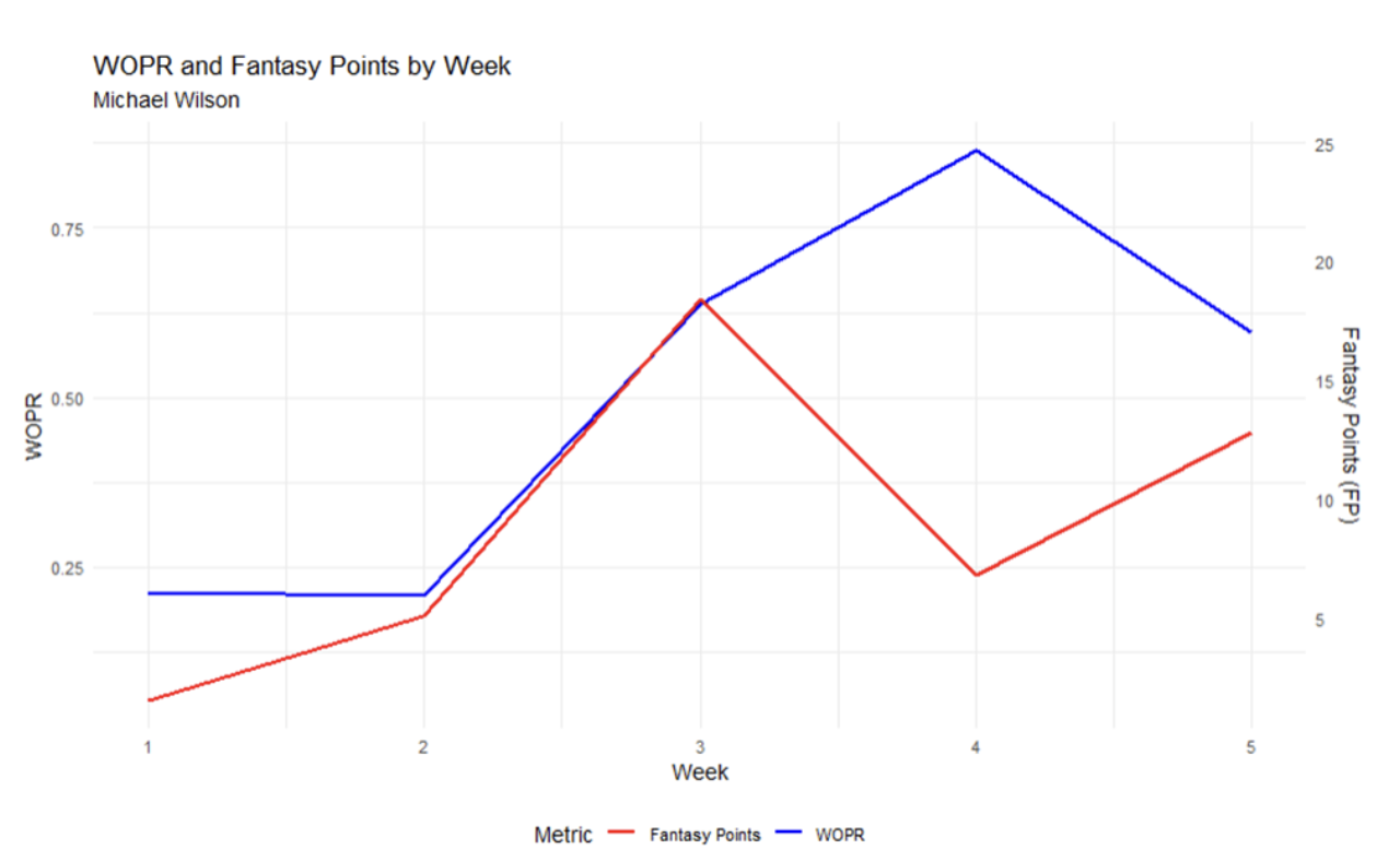 In the graph, Actual WOPR is represented in blue, while Fantasy Points (FP) are shown in red. In Week 4, we see Wilson’s Actual WOPR spike to an impressive .86, but he didn’t capitalize on that opportunity, finishing with only 6.8 fantasy points. Although his WOPR remained strong, it decreased to .59 the following week, yet he scored more Fantasy Points (12.8).