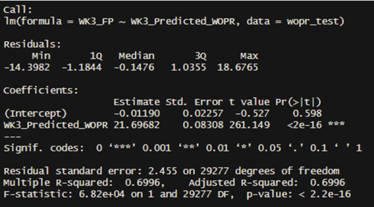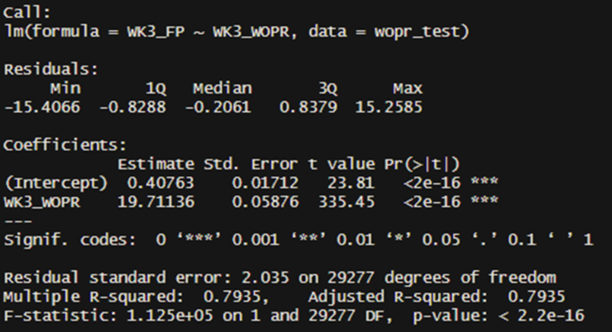 That’s a substantial amount of variance explanation! This demonstrates that Actual WOPR effectively captures what has occurred over the past three weeks. However, it’s important to note that we are not yet predicting future outcomes.