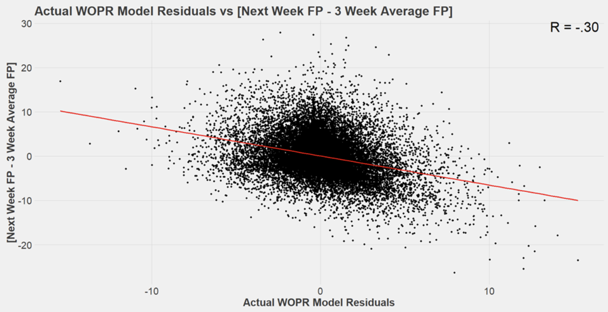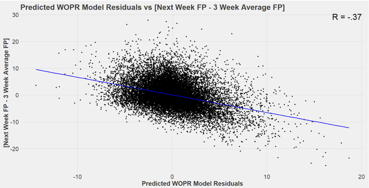 What ultimately matters is how the residuals predict future fantasy points. This is how we gain an edge in fantasy, DFS, or any other analysis we undertake.