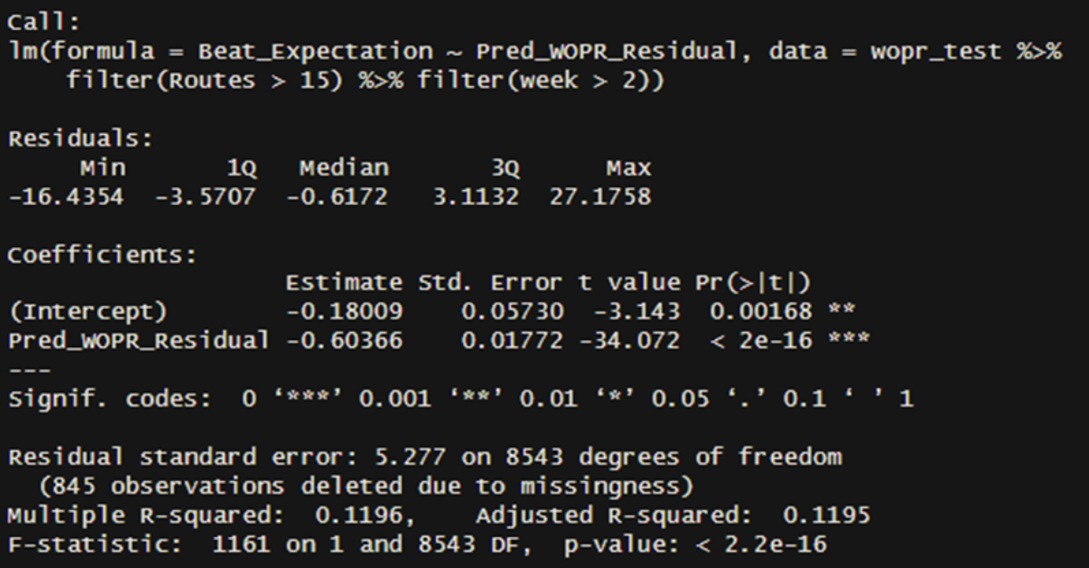 Using only our residuals, we can predict Beat Expectation (Next Week FP – 3-Week FPpG) with an R-squared (Rsq) of 0.12! This is a strong result, especially considering we are removing the three-week average in fantasy points from our response variable. In comparison, the model using Actual WOPR yields an Rsq of 0.08, demonstrating that our Predicted WOPR is superior.