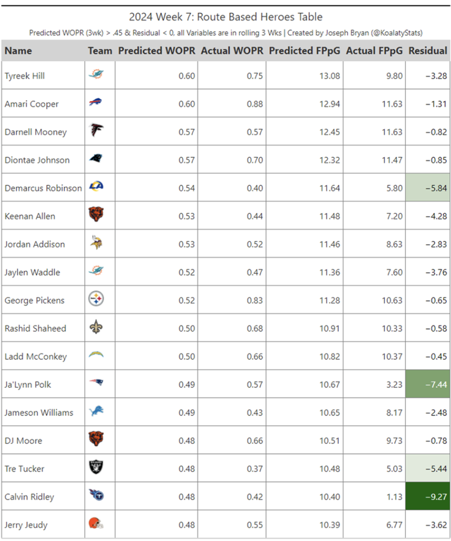 Route-Based Heroes is a weekly DFS/fantasy article I would like to deploy looking at players with a negative residual in the 3-Week Predicted Fantasy Points Model.