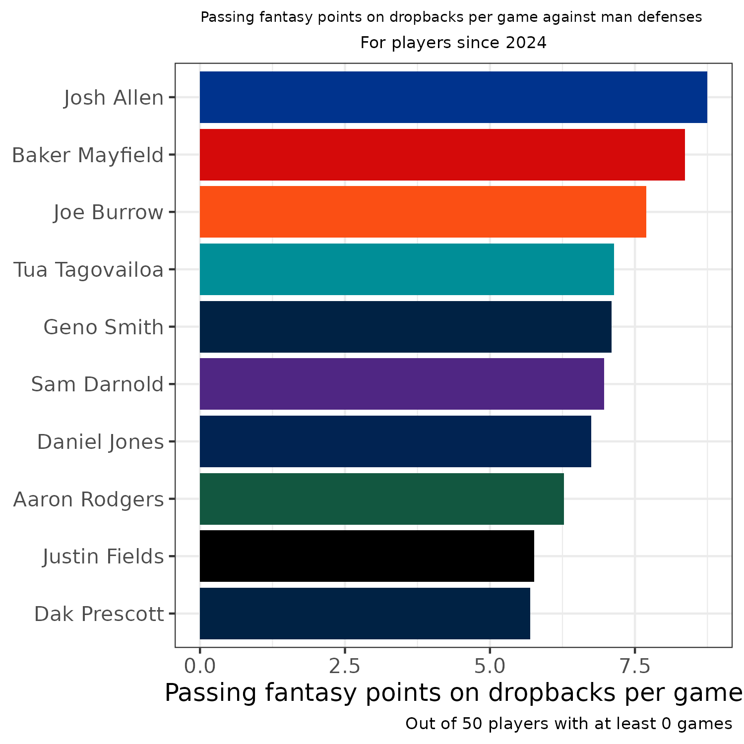 Fields has excelled over the past two seasons against man defenses. He has an 8.6% big-time throw rate compared to a 1.8% turnover-worthy throw rate against man. His 11.1-yard average depth of target against man means he’s likely to attack the Las Vegas Raiders’ defense. The Raiders deploy man coverage at the eighth-highest rate in the NFL. They’ve allowed a catch on 53.7% of deep and intermediate passes against — the seventh-highest rate in the NFL. Las Vegas has also forced an incompletion on such plays only 11.1% of the time (eighth lowest).