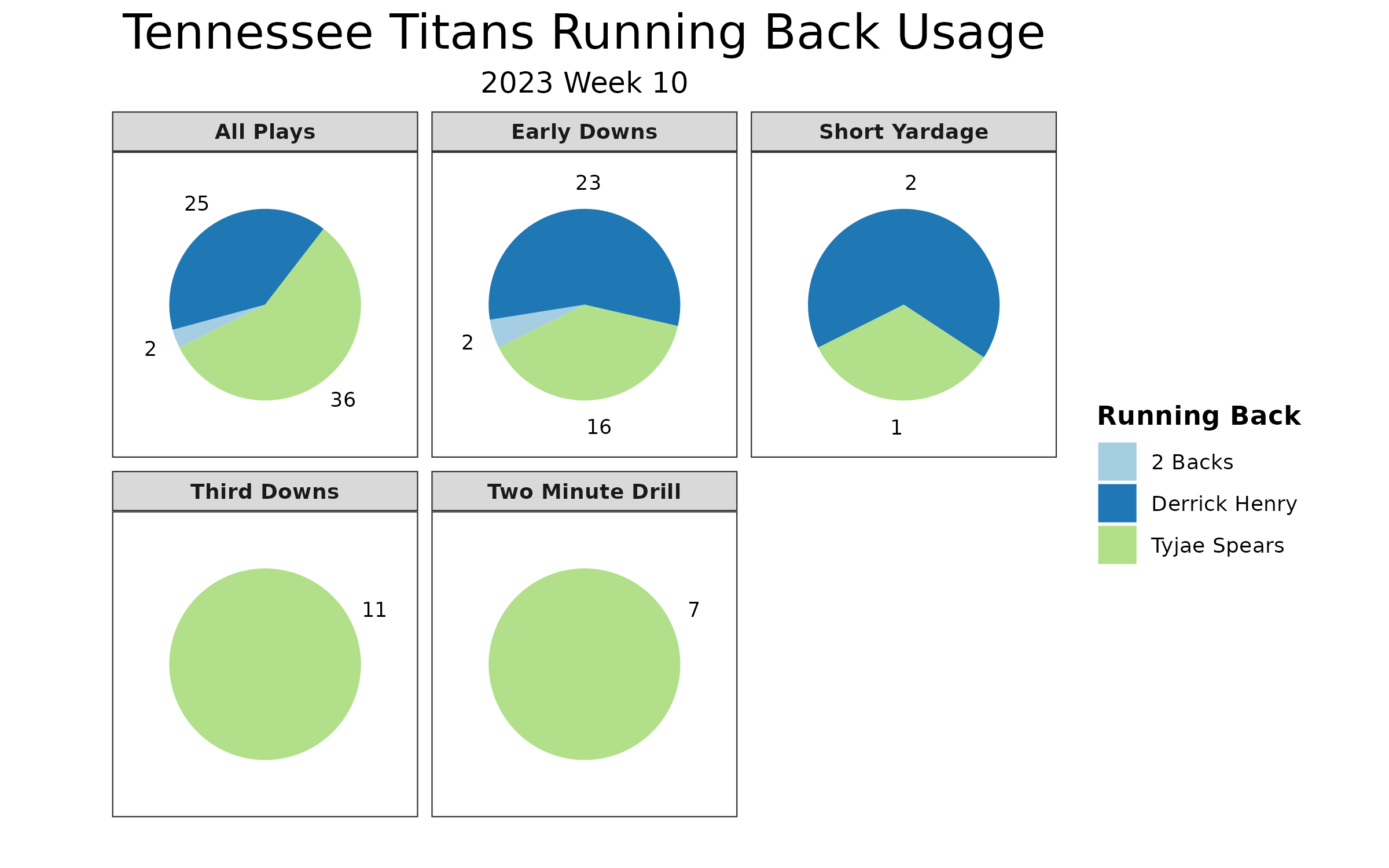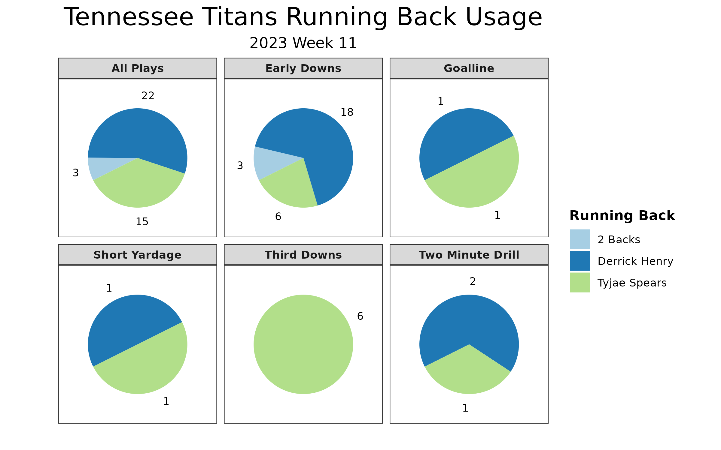 After incorporating running back utilization graphs in recap articles and on social media over the last few years, the idea was to dig deeper than snap counts to see how running backs were used to better understand each running back. For example, Tyjae Spears led the Tennessee Titans backfield in snaps in Week 10, but that was because they played more third-down and two-minute snaps than usual. Spears and Derrick Henry‘s roles didn’t change much in Week 11, but Henry was back on top of snaps due to the game script.