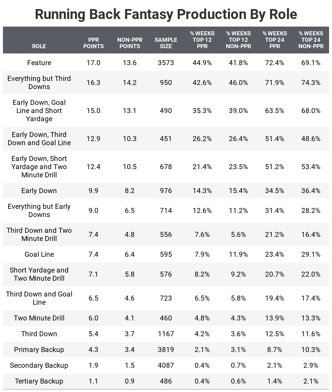 Below are the 16 most frequent roles with the average fantasy points someone scores in that role, and the percentage of games in which someone in that role finishes as a top-12 or top-24 fantasy running back.
