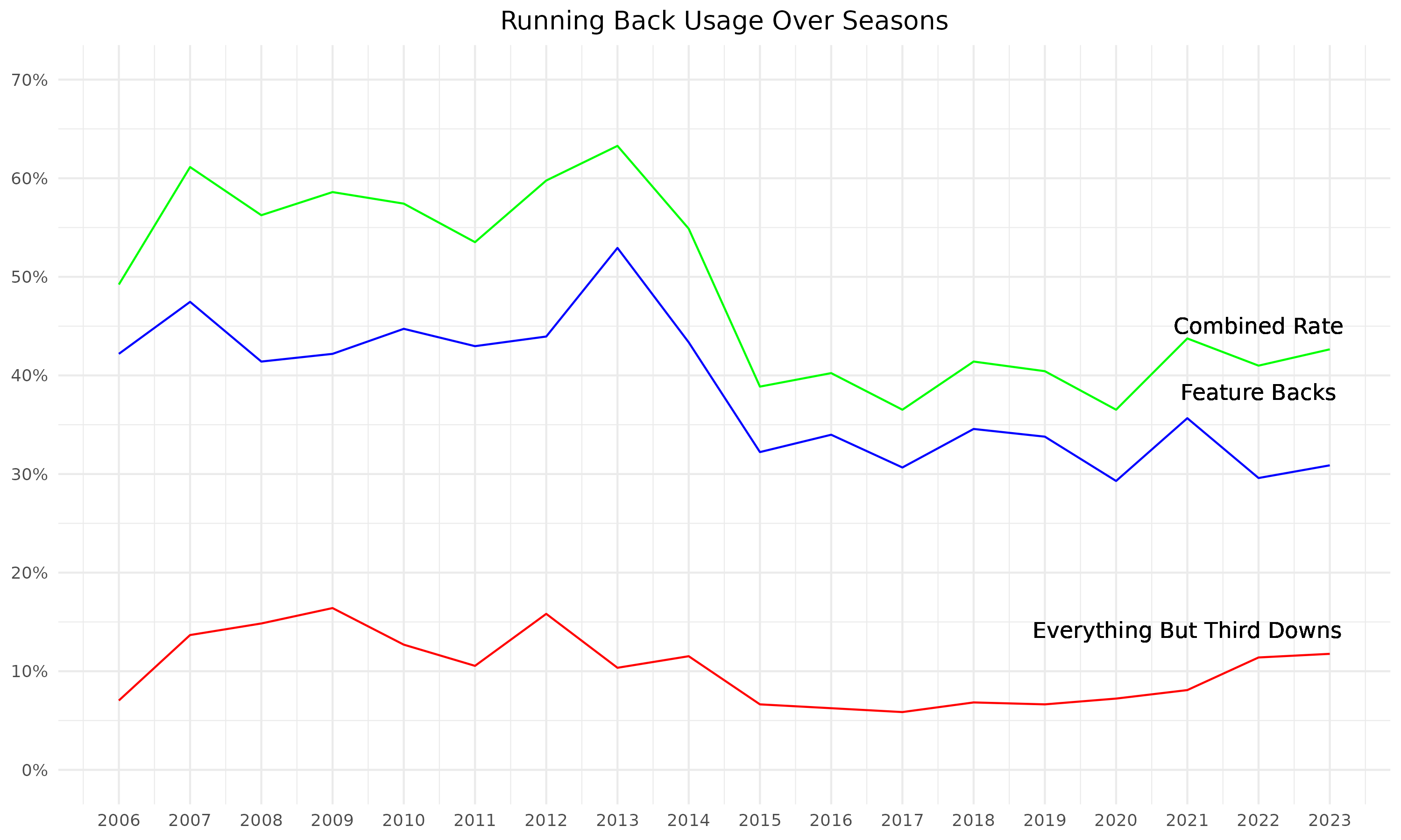 • The decline of the feature running back: Nine years ago there was a sharp decline in feature backs and not much has changed in that time.