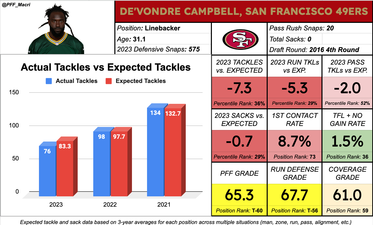 The 49ers have consistently used two full-time linebackers in the past and should be in line to do the same, even with Campbell replacing Greenlaw for the time being. Campbell had previously been losing snaps to former first-round pick Quay Walker in Green Bay but should be a safer fit in this 49ers scheme, creating a really strong value for a player who is being drafted beyond the top 50 at this position.