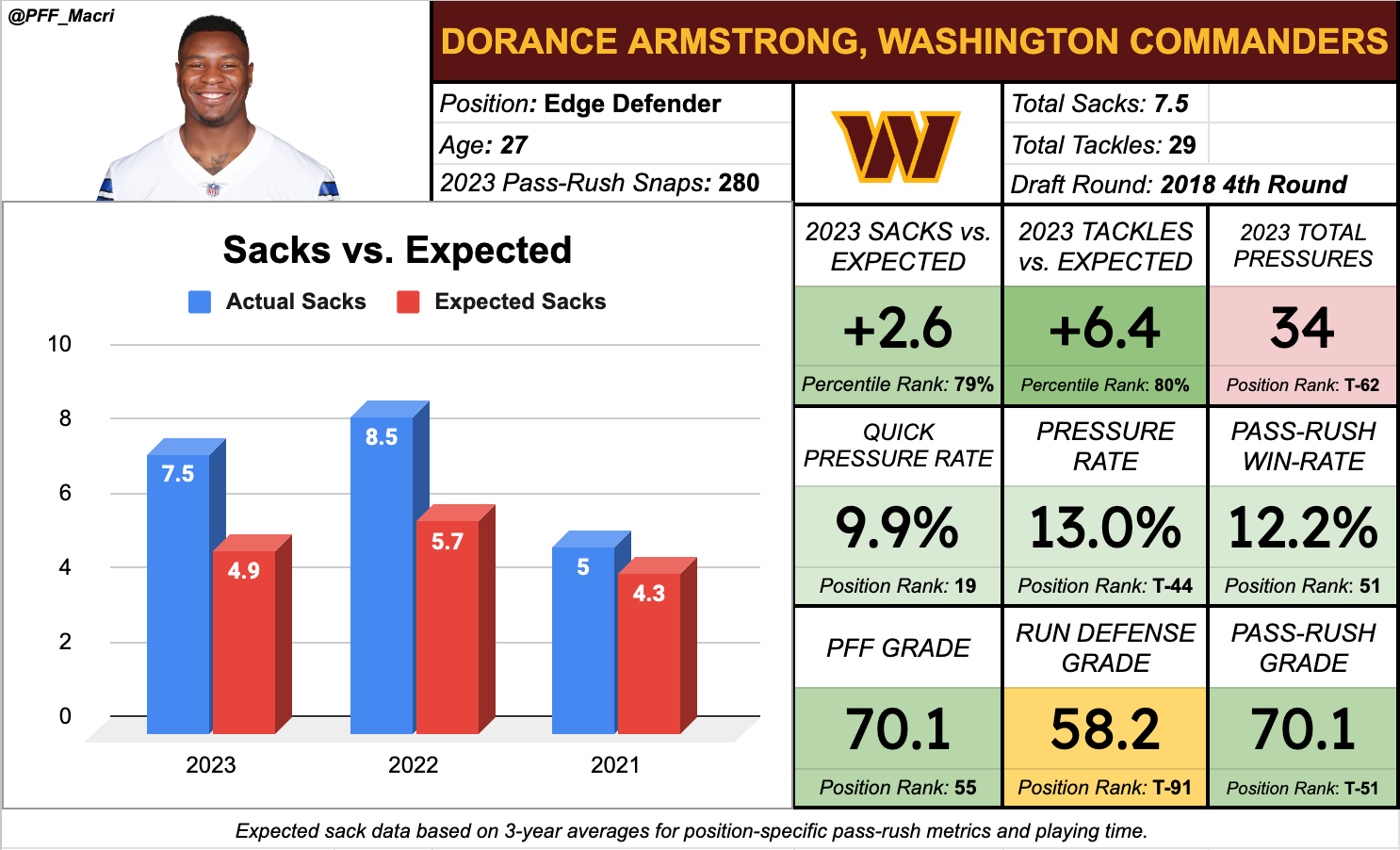 Armstrong has spent the entirety of his career to this point in Dallas and playing behind top players at his position like Demarcus Lawrence, Robert Quinn, Aldon Smith in addition to most recently Micah Parsons, Armstrong now joins the Washington Commanders, where no such competition exists. Both he and Dante Fowler reunite with head coach Dan Quinn and immediately become the most tenured and proven NFL veterans on the team. Armstrong, specifically, gets an excellent shot at setting new career highs in playing time and overall production.