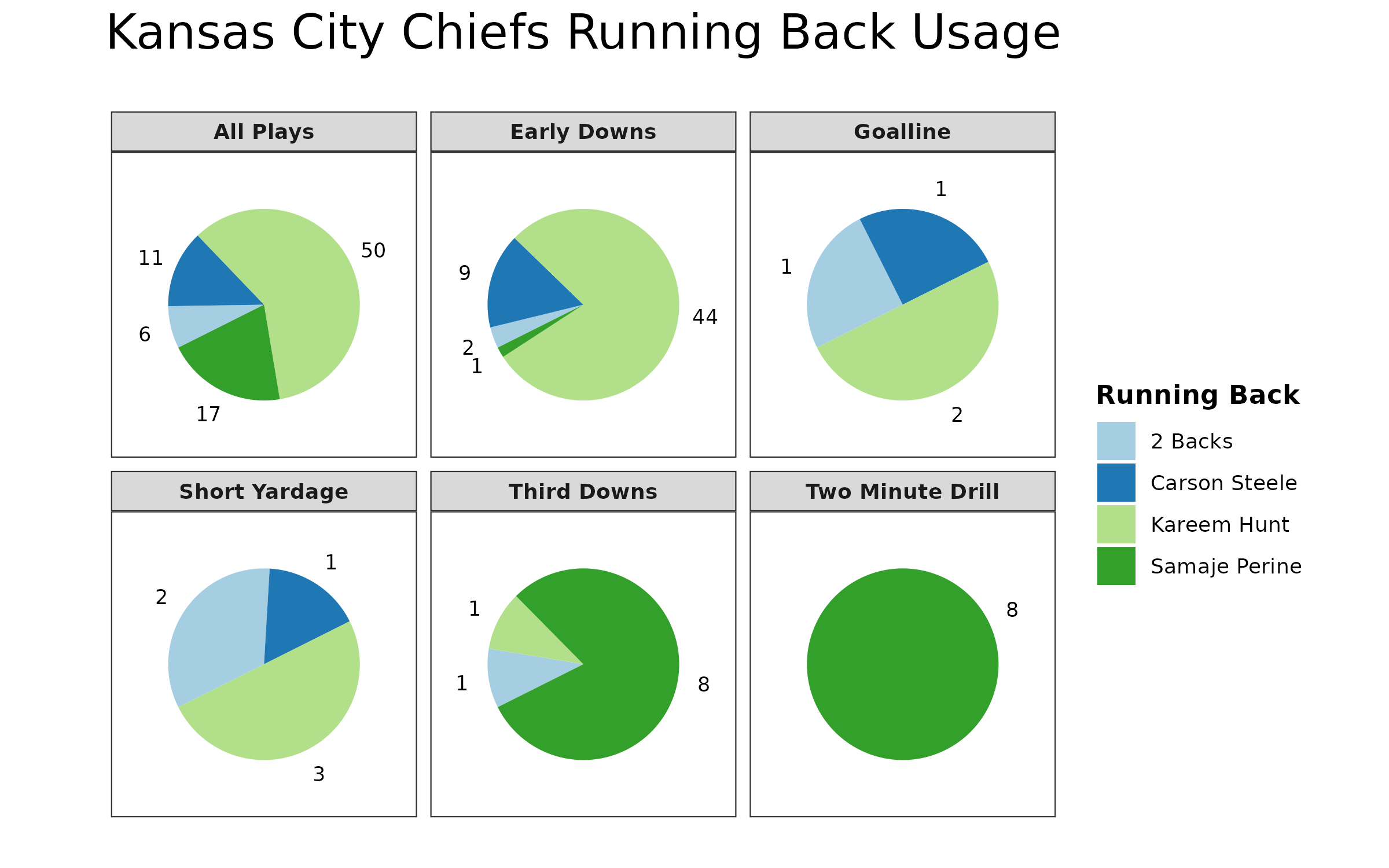 Hunt in the first half of this game didn’t see quite as much playing time as Pacheco early in the season, but the backfield split was reminiscent of the Chiefs’ 2023 rotation. Hunt had Pacheco’s 2023 role as the lead back, while Steele had Clyde Edwards-Helaire’s role as the early-down backup. Samaje Perine continued with his passing-down role. In the second half, the backfield was more reminiscent of early in the season, with Hunt dominating the early-down snaps.