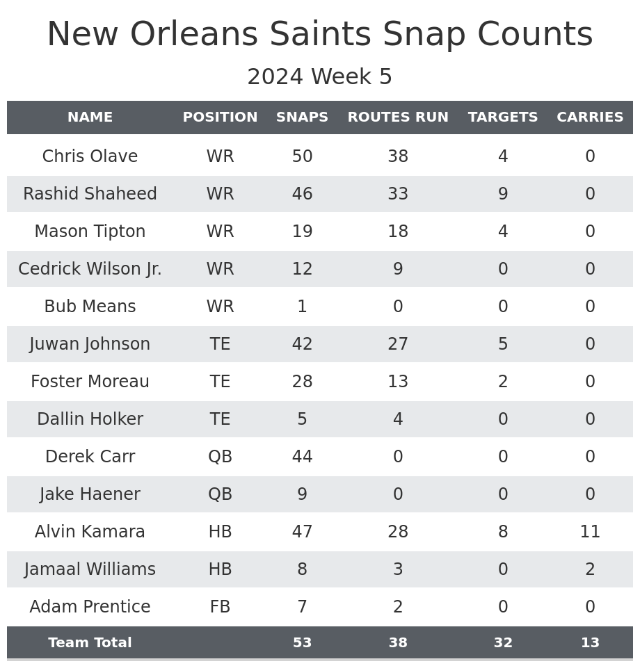• Snaps include plays called back due to penalties, including offensive holding or defensive pass interference. The other three stats have these plays removed.