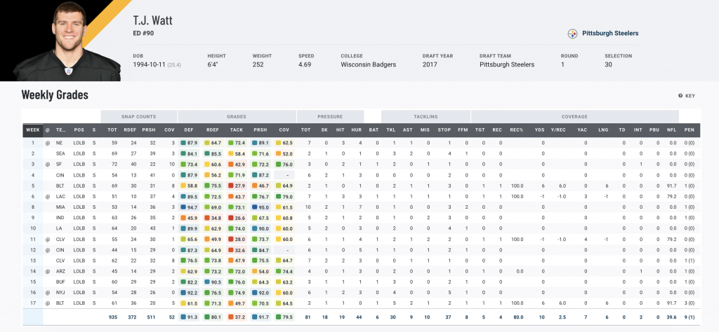 - Grades for each facet of a player’s game (receiving, run blocking, coverage, etc.) on a 0-100 scale.