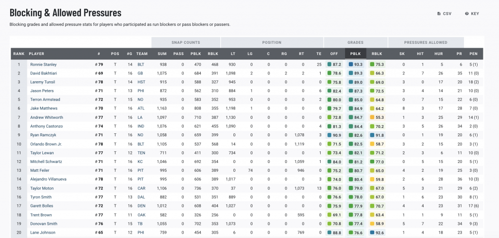 The benefits of this style of grading are numerous. Taking every play into consideration allows for a larger sample size of data to tell the proper story rather than just a highlight reel of plays that we tend to remember, for better or worse. We also work to eliminate bias by not caring about the level of player who is being graded, so whether it’s the best tackle in the league missing a block or one of the worst, the same grade is given. Preconceived level of ability has no impact on the grading system. This style has worked well in unlocking undervalued gems through the years, while also not being swayed by player hype if it is undeserved.