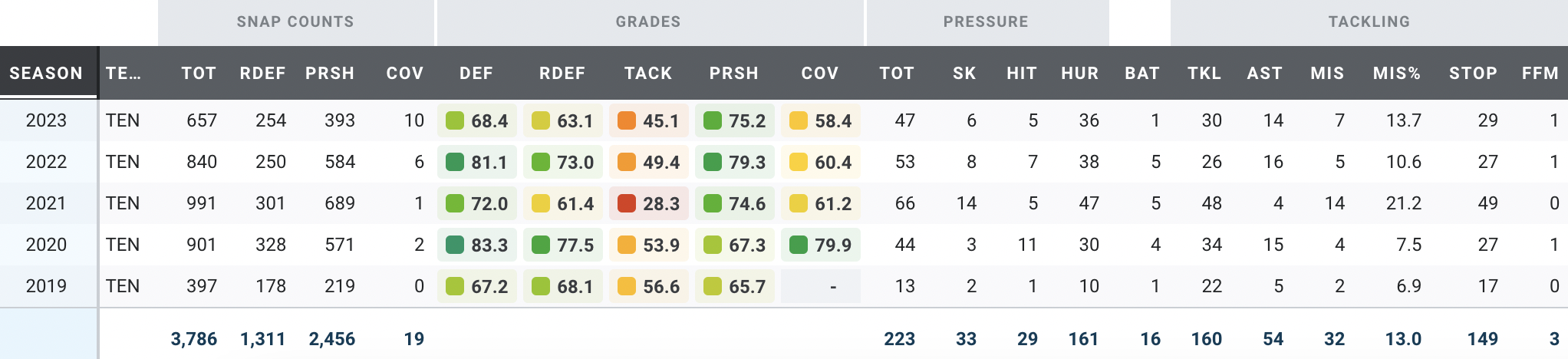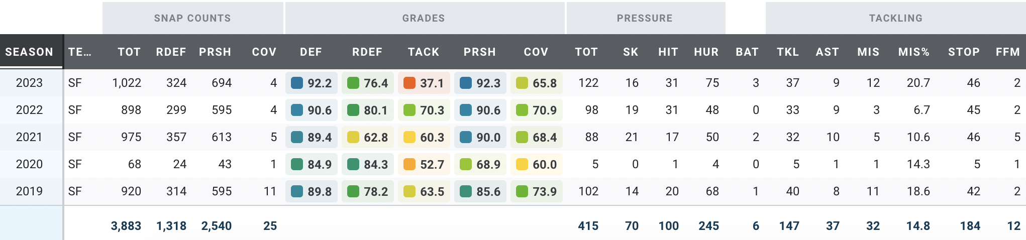 Like Garrett, Bosa has been dominant since he entered the league. He has a Defensive Player of the Year award in his trophy case with elite PFF grades in almost every year of his career.