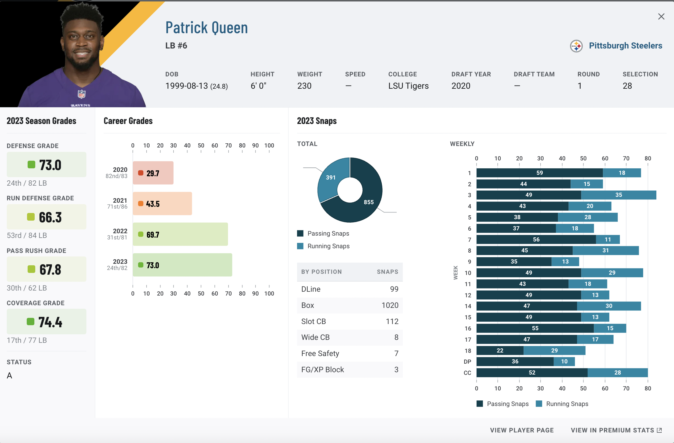 Queen’s career got off to a rough start, as he recorded 29.7 and 43.5 PFF overall grades in his first two seasons. But his past two single-season grades have been above 70.0. That high overall grade was based on much better coverage grades in 2022 and 2023. Fortunately for him, the competition at this pick number wasn’t too stiff.