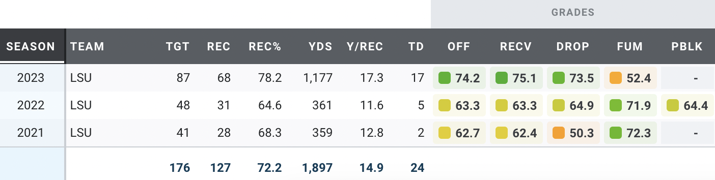 Thomas was a dominant force at LSU. Despite teammate Malik Nabers receiving more of the shine, Thomas was incredible in his own right. He caught 68 of his 87 targets for 1,177 yards and a Division I-leading 17 touchdown receptions in 13 games (FCS receivers included). Thomas possesses ideal size at 6-foot-4 and 205 pounds while also having great speed after running a 4.33-second 40-yard dash at the NFL Scouting Combine, which made him a tantalizing prospect from a physical standpoint.