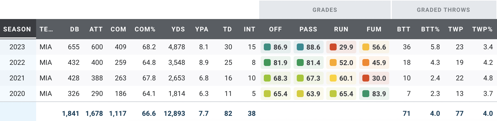 Tagovailoa led the NFL in passing yards in 2023 while tossing a career-high 29 touchdowns, helping the Dolphins earn their keep as one of the elite offenses in the NFL. His passing grades have steadily climbed each year, and Tagovailoa led the NFL with a 90.2 PFF passing grade this past year. His 88.4 PFF overall grade was a clear career high, too. Moving on from that production and bringing in a rookie — or another quarterback who isn’t as clued in on the system — is a gamble.