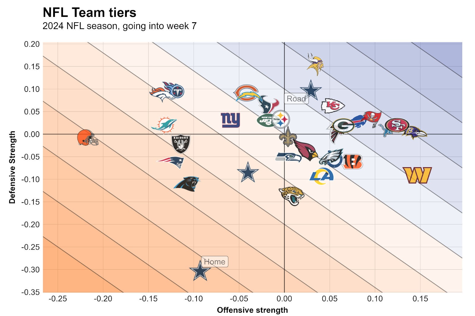 The following team tiers chart — based on expected points added per play with adjustments for predictive power — accounts for the general strengths of opposing teams. In addition to all 32 teams, we added two Cowboys logos to show where they would rank if the home and road results were split into two different teams.