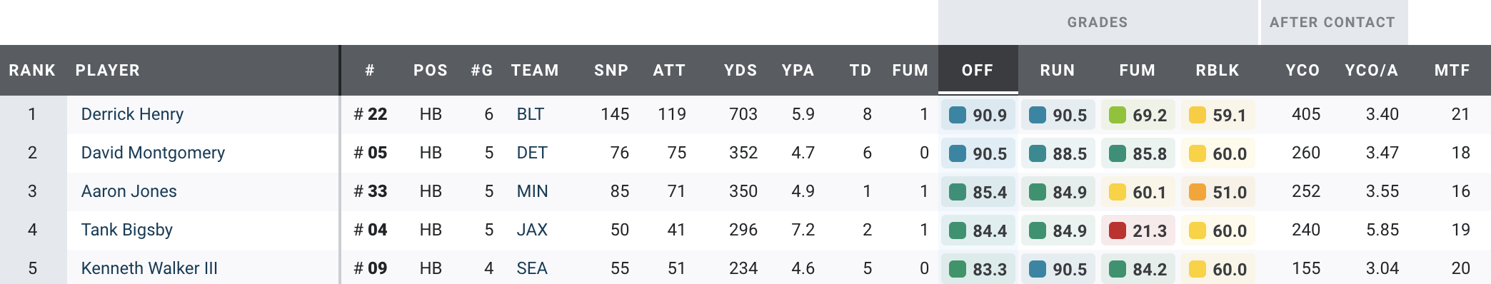 Henry currently leads the NFL with 710 rushing yards, almost 100 more than Jordan Mason in second place and almost 200 more than Josh Jacobs in third place. Henry’s 419 yards after contact also leads the league and trails only eight other backs’ total rushing yards. Henry’s 90.5 PFF rushing grade is tied with Kenneth Walker III for best in the league, but Henry's comes on 70 more rushing attempts. He also leads the way with eight rushing touchdowns and 35 first downs, is tied for fifth with 21 forced missed tackles and ranks second with 14 explosive runs. All of this has come at an age when a running back’s production should be declining.