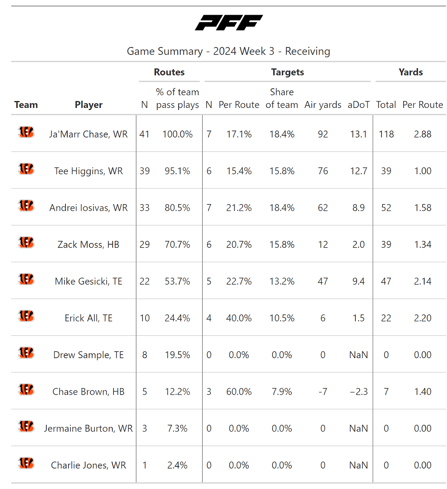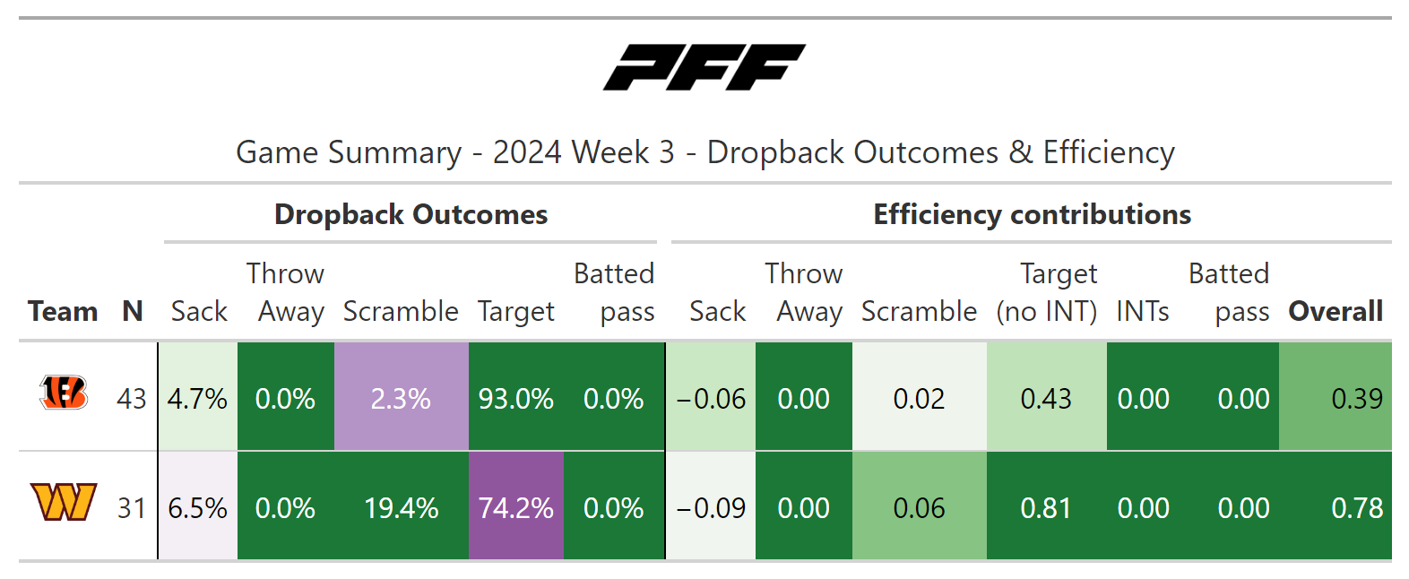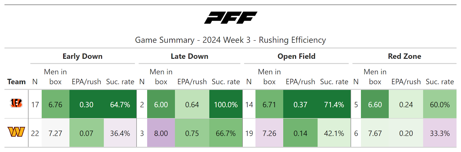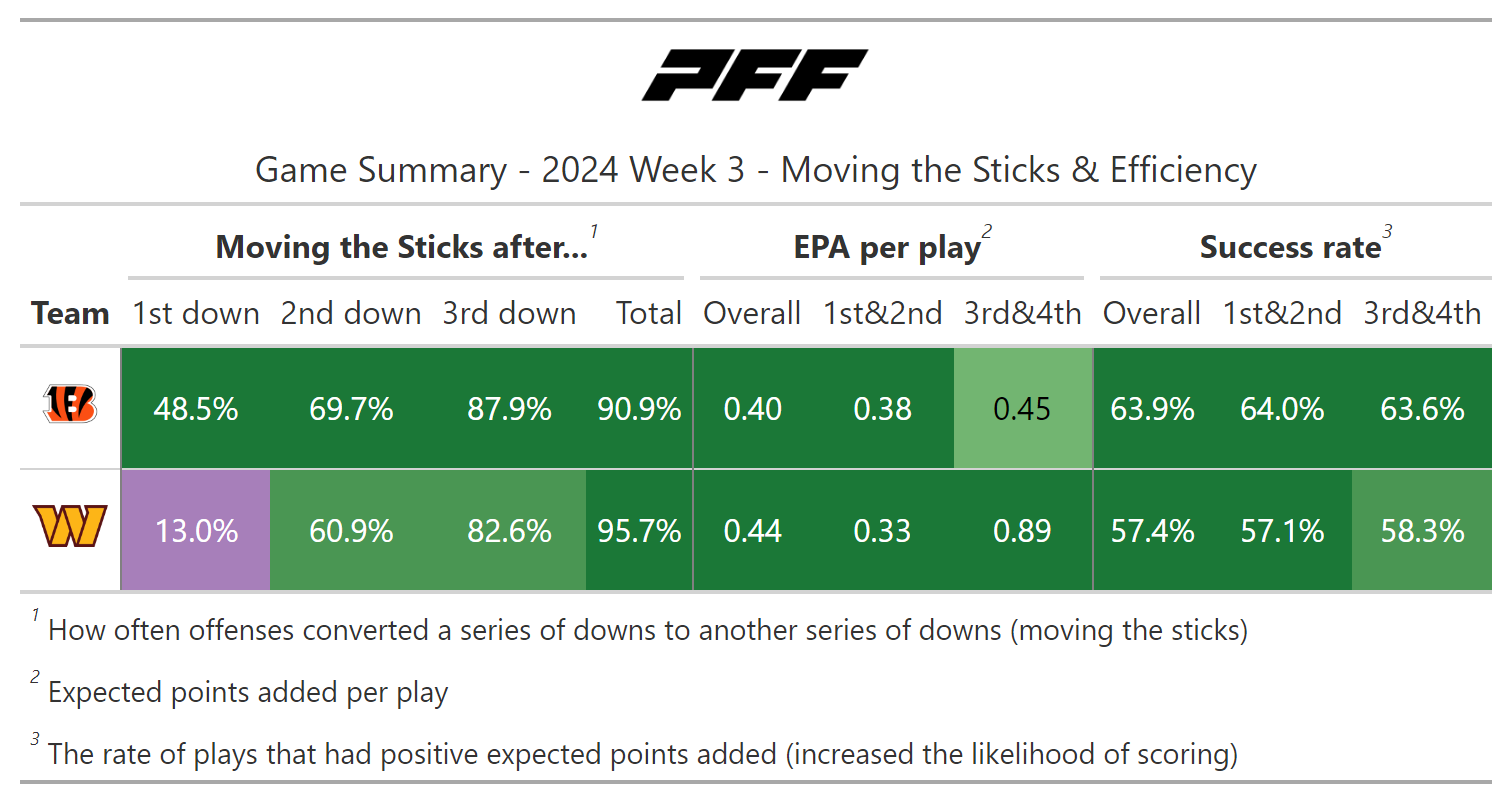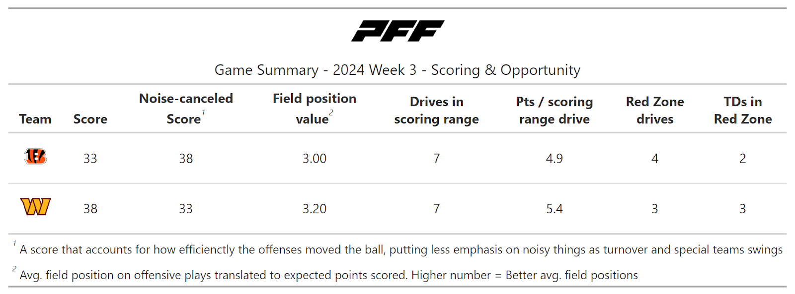 According to PFF's new noise-canceled score metric, it was, of course, a close game, but the Bengals could have very well won the contest. In a game where both teams moved the ball at will, the Bengals had two game-deciding mishaps that caused them to fall back to an insurmountable deficit: a missed field goal by Evan McPherson and goal-line stands by the Commanders' defense on back-to-back drives in the first half.