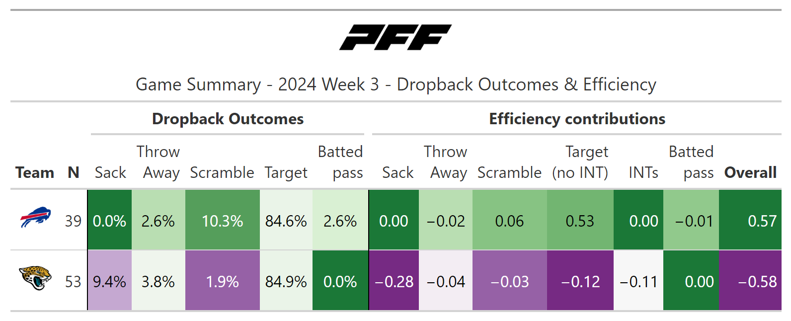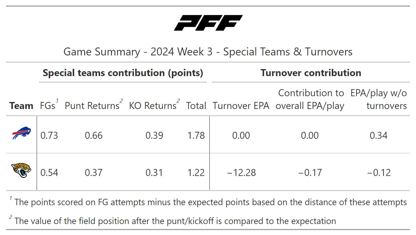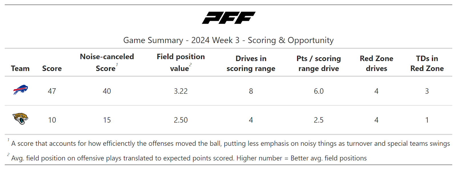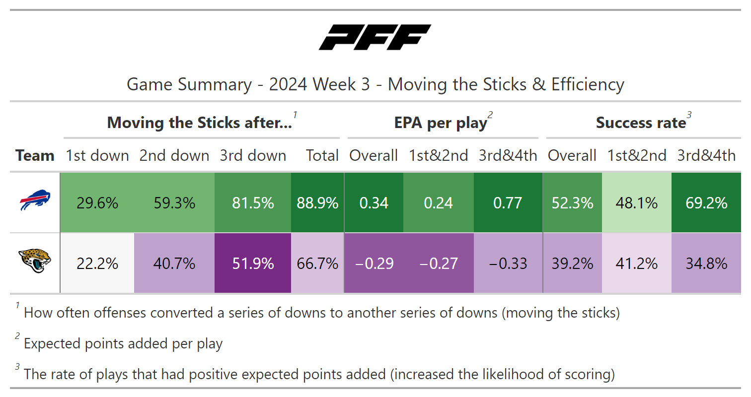 According to PFF's new noise-canceled score metric, this game wasn’t close, as we could all see. The Bills not only moved the ball at will but also scored touchdowns at will, as the Jaguars failed to stop them from doing so on every drive in the first half.