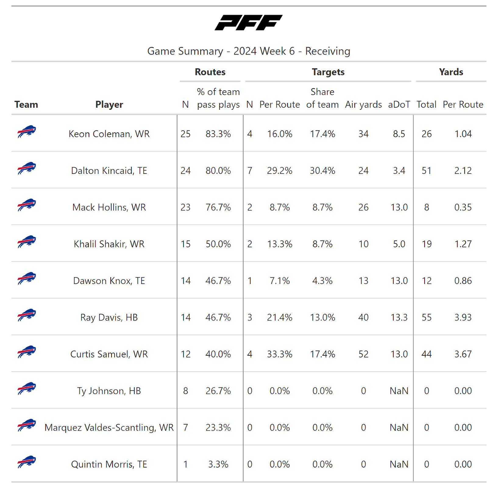 None of the Bills' receivers recorded many yards, but that was partly due to the Jets' defense backs committing defensive pass interference instead of allowing catches.