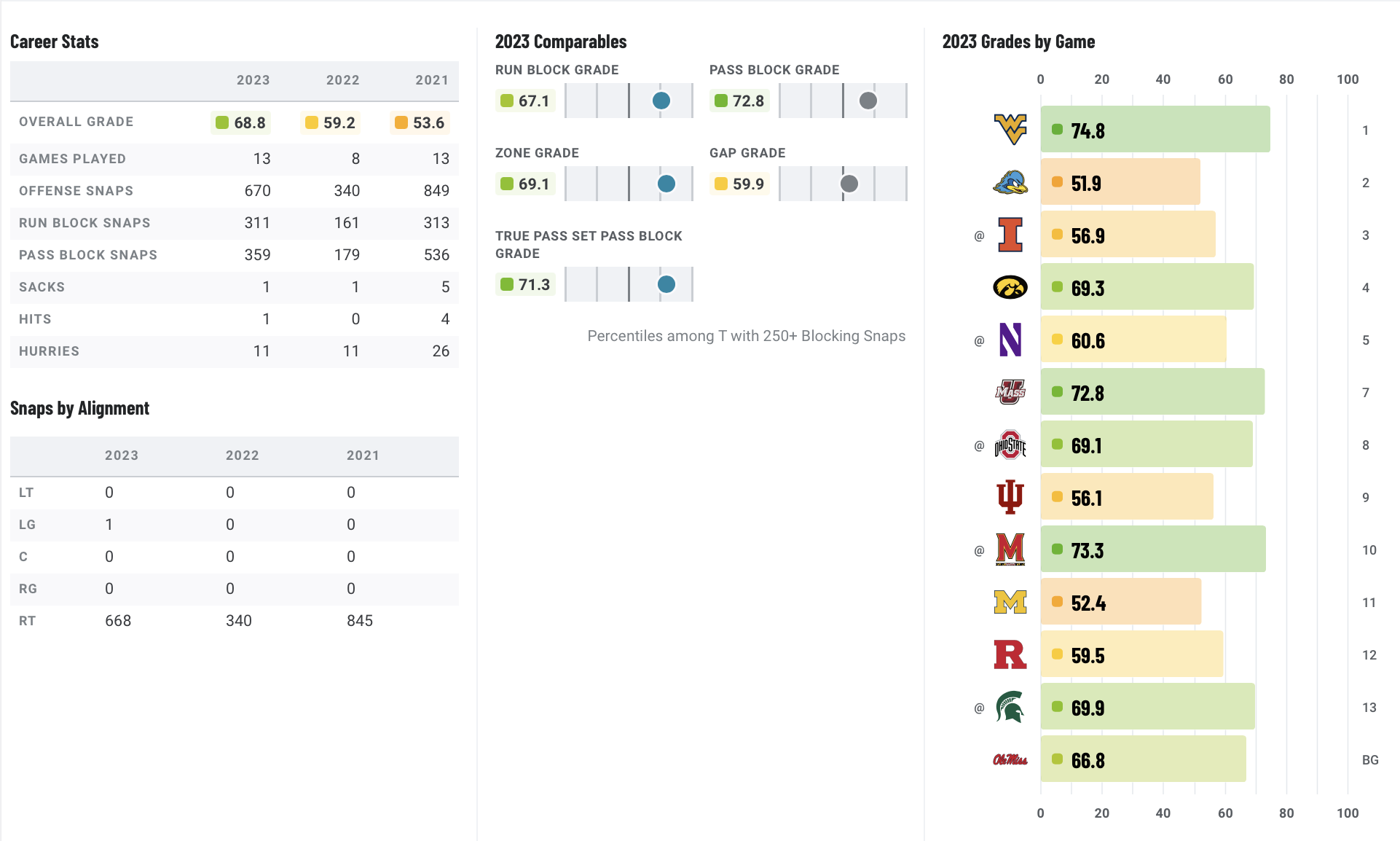 Wallace is a mountain of a man at 6-foot-5 and 341 pounds. He played pretty well this past season in Happy Valley, too, posting a 70.4 PFF grade and a 72.8 pass-block grade. However, he was considered a massive reach for the Patriots, as he came in at No. 142 on the PFF big board.