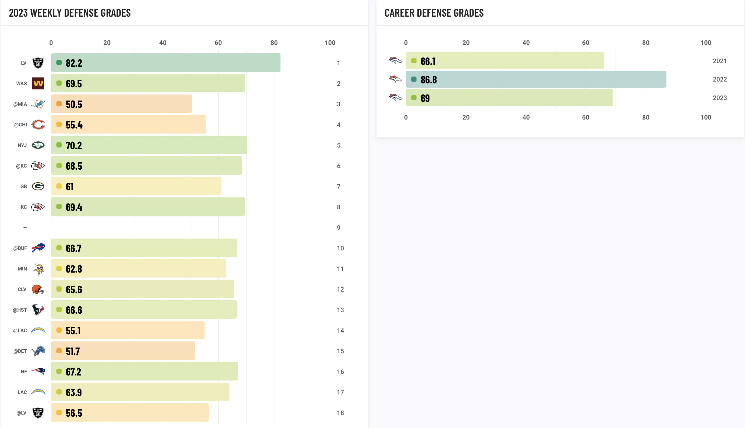 Samuel has big shoes to fill, but his play over the last two years has shown that he is more than capable of doing so. His 80.8 grade since 2022 is 12th at the position, even though he has given up 11 touchdown passes. He’ll need to prevent separation at a higher rate if he is to move up the rankings.